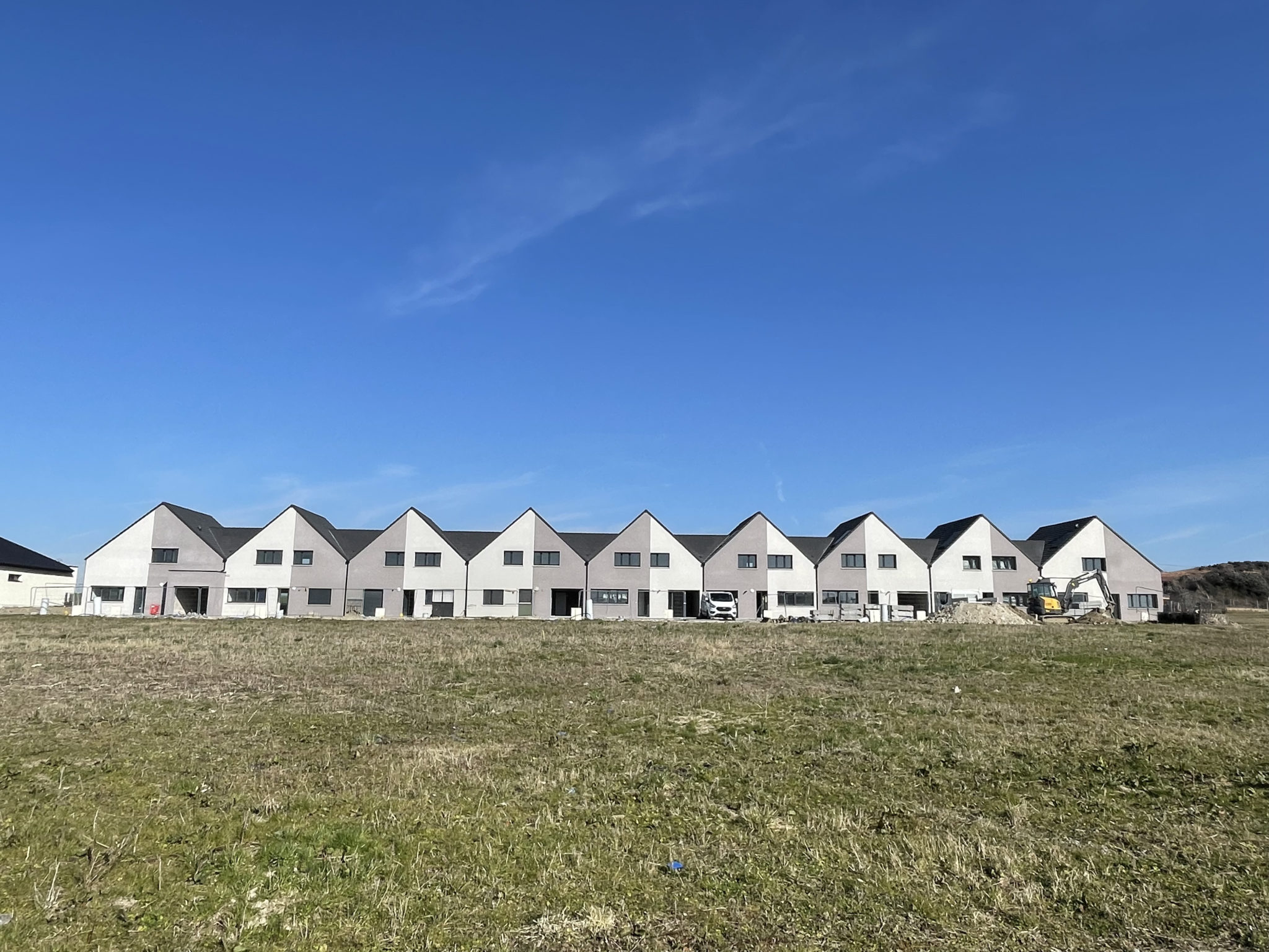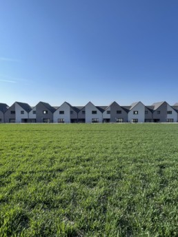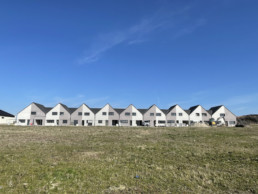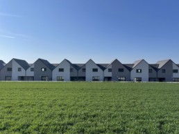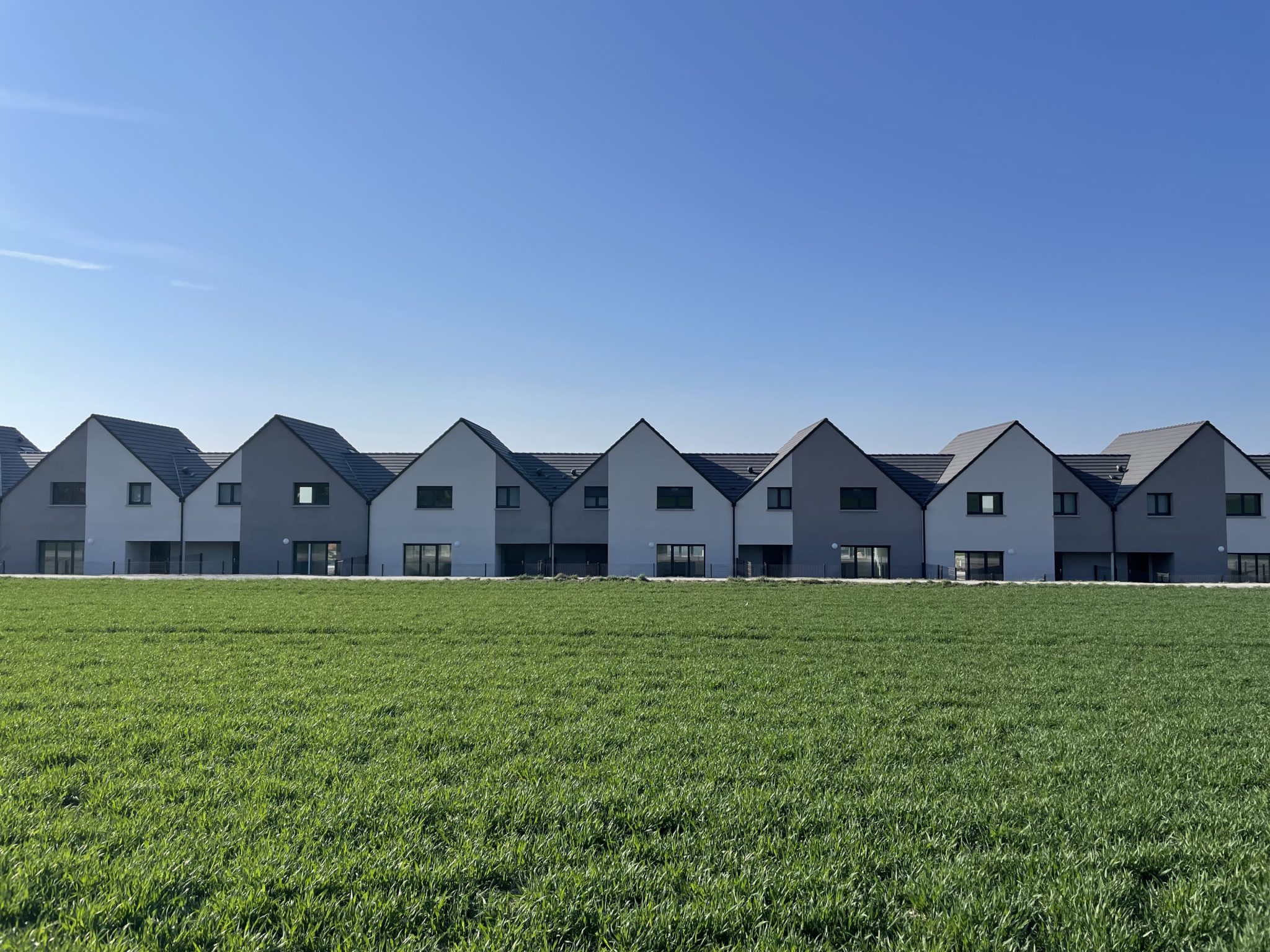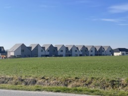 Construction de 9 logements T4 (6 PLU et 3 PLAI). 2 Logements seront entièrement aménagés pour Personne à Mobilité Réduite, les 7 autres logements seront facilement adaptables pour PMR. En réponse au contexte du projet, nous optons pour des maisons mitoyennes et jumelées. La maison compacte avec un séjour traversant reste le point de départ. Ce choix est confirmé par l’orientation géographique du macro-lot : les façades principales se tournent vers le Sud afin d’augmenter les apports de lumière. Cette disposition dialogue avec son paysage lointain, dès l’entrée Nord de la commune. La différenciation envisagée entre les maisons a été prise en compte. Les deux maisons d’extrémité sont réservées aux logements PMR, avec une troisième façade. Non seulement ils bénéficient d’une lumière complémentaire en pignon et d’une visibilité supplémentaire, mais ils bénéficient également d’un espace extérieur latéral. Les 7 autres maisons profitent d’un jardin de devant confortable orienté Sud, une transition agréable entre privé et public.