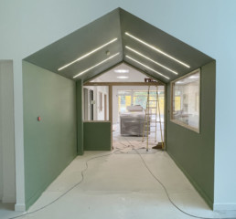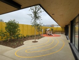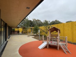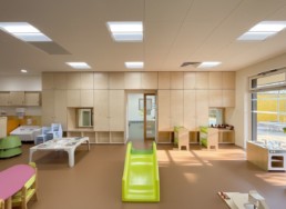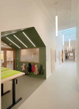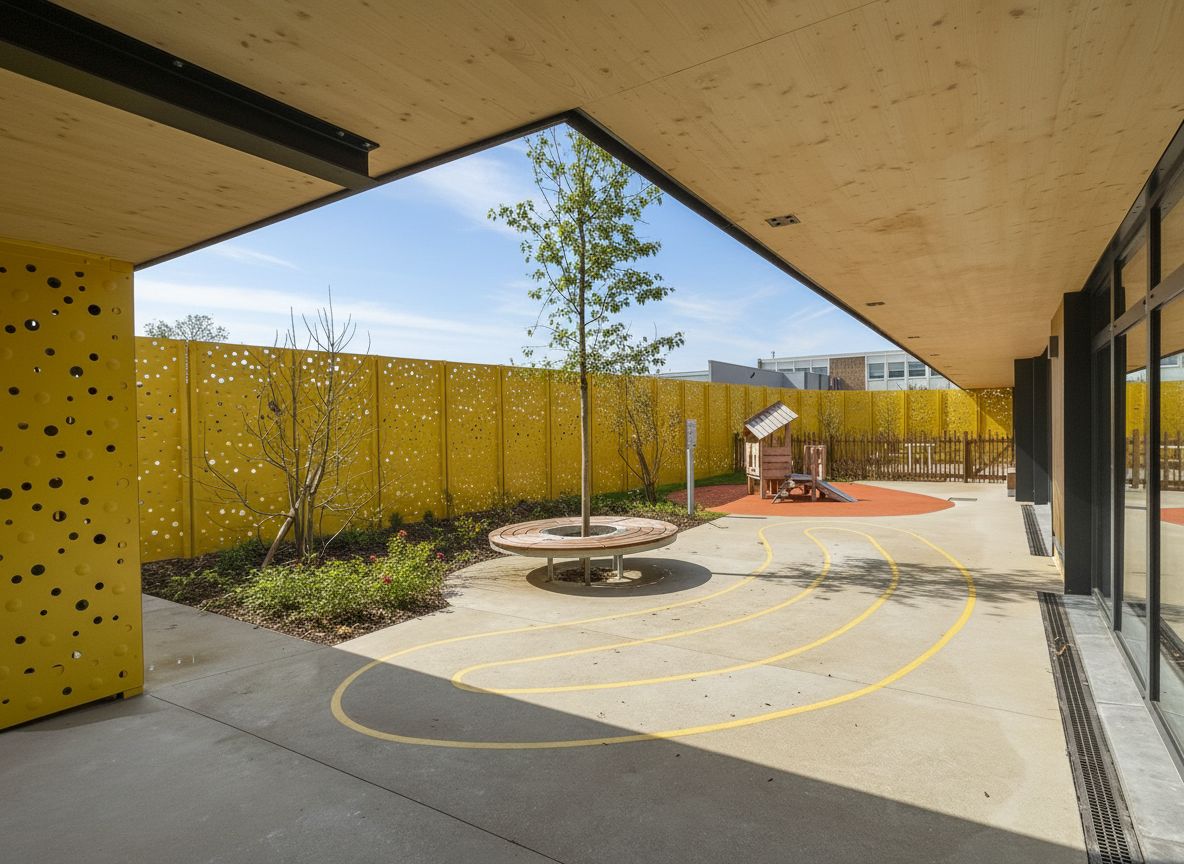 Né de son environnement et du caractère arboré du terrain existant, la crèche est intégrée à son environnement urbain, dans lequel elle est nichée. Un long volume compact à l’horizontale soulignée de sa couverture végétale s’intègre sur le site. La toiture s’incline pour chercher la lumière naturelle au cœur du bâtiment et permettre la ventilation naturelle des espaces de la crèche. Elle est aussi support de panneaux solaires.